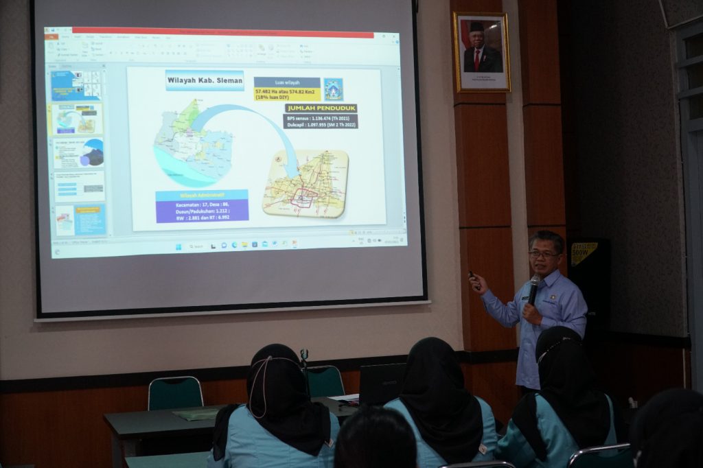 Bapak Drs. Susmiarto, M.M. mengucapkan selamat datang kepada mahasiswa dan dilanjutkan dengan penyampaian materi gambaran umum tugas pokok dan fungsi Dinas Kependudukan dan Pencatatan Sipil Kabupaten Sleman serta pelayanan Dokumen Kependudukan. Beliau memperkenalkan seluruh pejabat baik struktural maupun fungsional yang ada di Disdukcapil Sleman. Beliau berharap seluruh mahasiswa dapat menjalankan kuliah praktik dari bulan Februari sampai dengan bulan Juli 2023 dengan baik dan sungguh-sungguh, karena pengalaman di lapangan akan menjadikan pengetahuan dan wawasan menjadi meningkat.